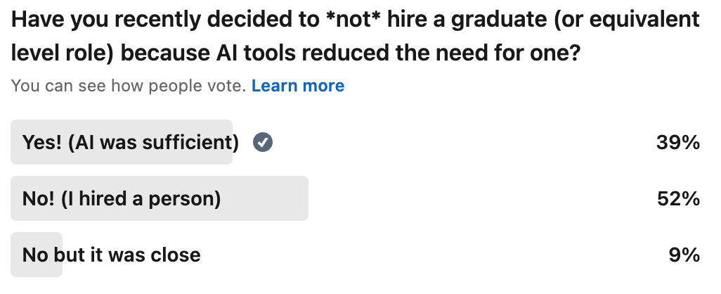 “Is AI killing graduate jobs?”, asked the Financial Times a few days ago. “Not really but kinda-maybe-soon” is a pretty good approximation of their answer. I’d written broadly about this a few weeks back in my Gen Z Might Be Screwed post, looking at similar data. Over the weekend I took a slightly more scientific approach to my anecdata with some LinkedIn polling. The results add a bit more of a quantitative (and real-time) shape to the trend: